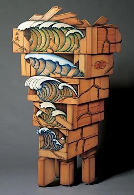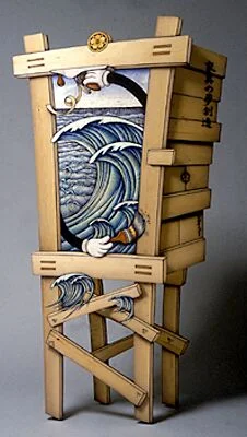 The Heavenly Victory Series and Kosode Cabinet Series (2007-2010) are large-scale functional cabinets in the form of Kimonos or "Kosode". Many have usable drawers, revealed by swinging open a hinged, flat facade. The kimono pieces are made using a technique that employs a variety of woods, aniline dyes, and epoxy resins.