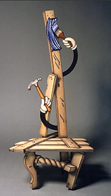 Chair forms have been a staple of John's work since the Early Chairs (1991-1994). They continue through the Wave Series (1990-1995), Conservation Series (1997) and Furniture that Builds Itself Series (2003-2005). A new generation of chairs emerges in the This is Not Lunch Series (2007-2010), Treachery of an Economy Series (2009-2012) and the Drapery Series (2010-2012). The chairs are completely functional and weight-bearing. Although they appear three-dimensional, the facades are primarily flat. The pieces are made using a technique that employs a variety of woods, aniline dyes, and epoxy resins.